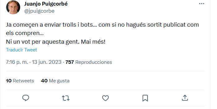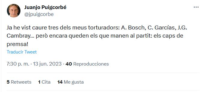 En su cuenta de twitter asegura que su experiencia en ERC fue «nefasta» y en un mensaje da nombres de los que considera sus «torturadores», como el recién cesado consejero autonómico de Educación, Josep González-Cambray. Aunque considera que «todavía quedan los que mandan en el partido: los jefes de prensa».