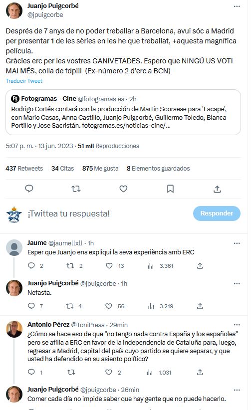 En un tuit en su cuenta personal ha dicho que «después de siete años de no poder trabajar en Barcelona hoy estoy en Madrid para presentar una de las series en las que he trabajado, más esta magnífica película [Escape]. Gracias a ERC por sus navajazos. Espero que nadie os vote nunca, panda de hdp (ex número 2 de ERC en Barcelona).