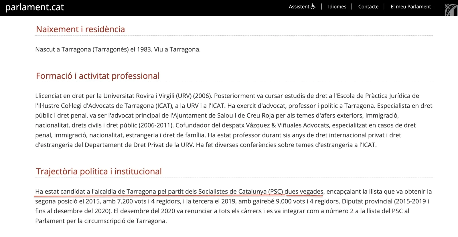 Resulta curioso como algunos candidatos tratan de esconder su pasado político, eso sí de una manera muy torticera. Es el caso de Rubén Viñuales, alcaldable de PSC por Tarragona y quien entró en política de la mano de CS, de hecho fue alcaldable de los naranjas hasta en dos ocasiones. Pero en su perfil parlamentario asegura que ya fue candidato por los socialistas, tal y como han destapado los compañeros de El Món.
