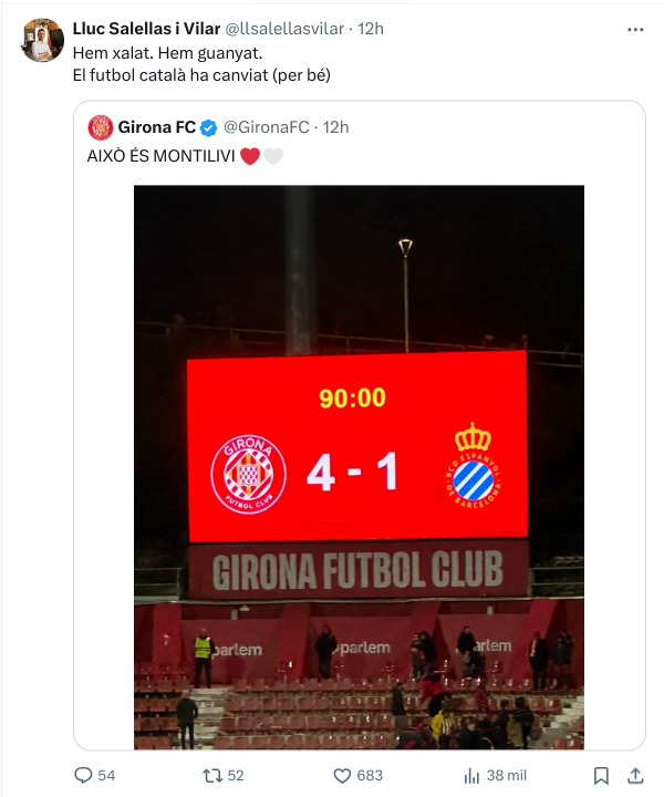 “Hemos enloquecido. Hemos ganado. El fútbol catalán ha cambiado (para bien)”, afirmaba Salellas en su cuenta de X. Habría que recordarle al antisistema, que ‘su’ Gerona lleva un cuarto de hora en Primera División, mientras que el Espanyol es un club fundador de Laliga, un histórico del fútbol nacional.