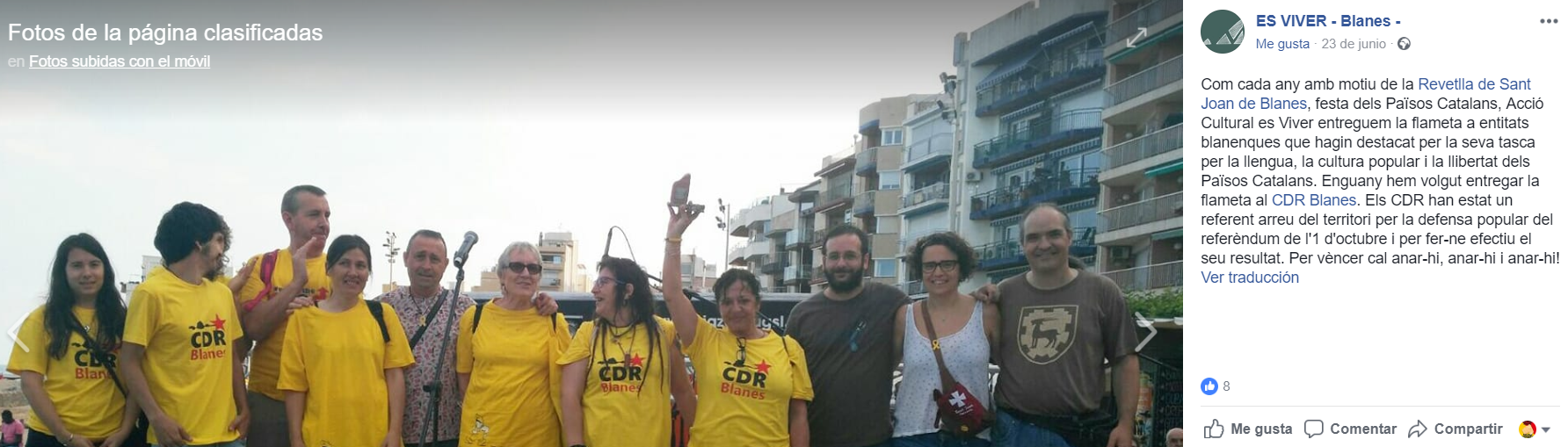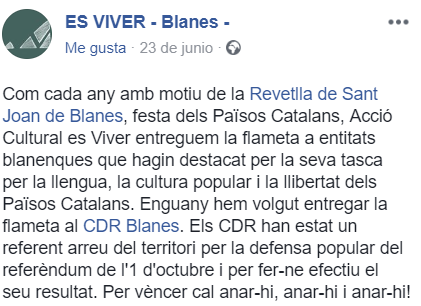 El motivo de Es viver para dar su premio «a la entidades de Blanes que hayan destacado por su tarea por la lengua, la cultura popular y la libertad de los Países Catalanes» al CDR fue por «su defensa popular del referéndum del 1 de octubre y por hacer efectivo su resultado. ¡Para vencer es necesario ir, ir e ir».