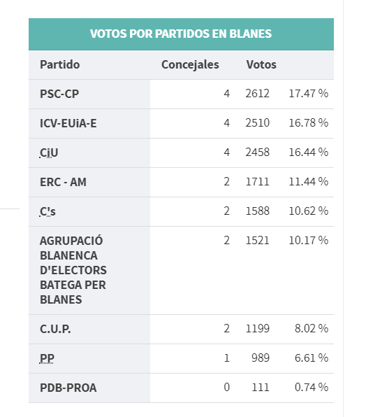 ¿Cuál es la realidad sociológica de Blanes? Los resultados de las municipales de 2015 fueron los siguientes: