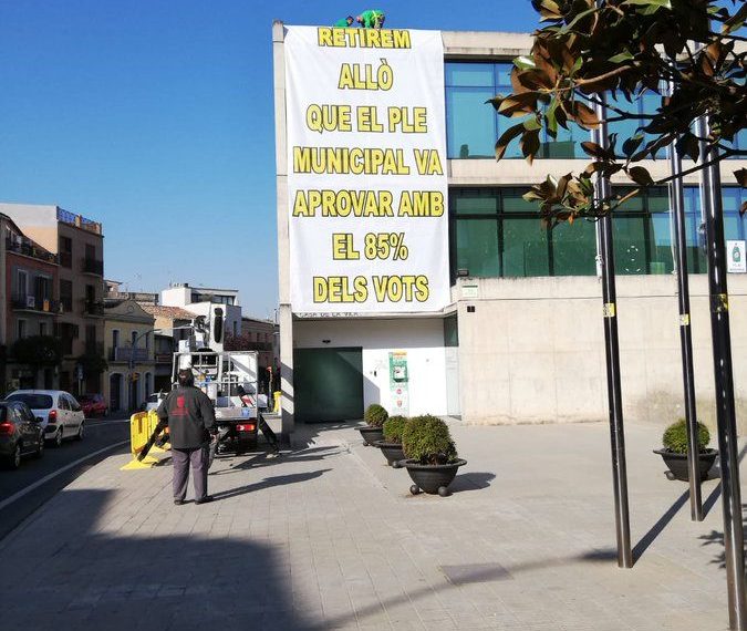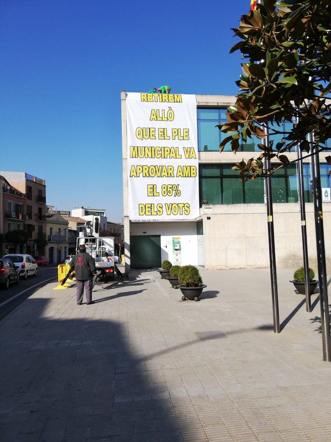 Han tapado los lazos amarillos que «adornaban» la fachada del consistorio con una gran pancarta de dos pisos con el siguiente lema: «Retiramos lo que el pleno municipal aprobó con el 85% de los votos«.