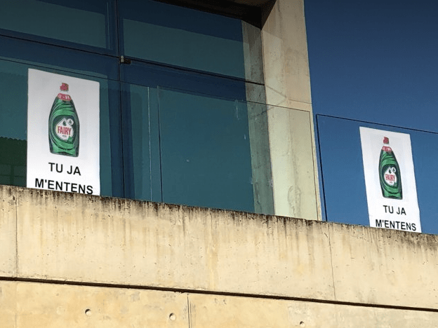 Sin tener suficiente con esto, además han colocado imágenes del limpiavajillas Fairy, en alusión a lo que declaró en su día el que fuera Delegado del Gobierno, Enric Millo, ante el Tribunal Supremo.
