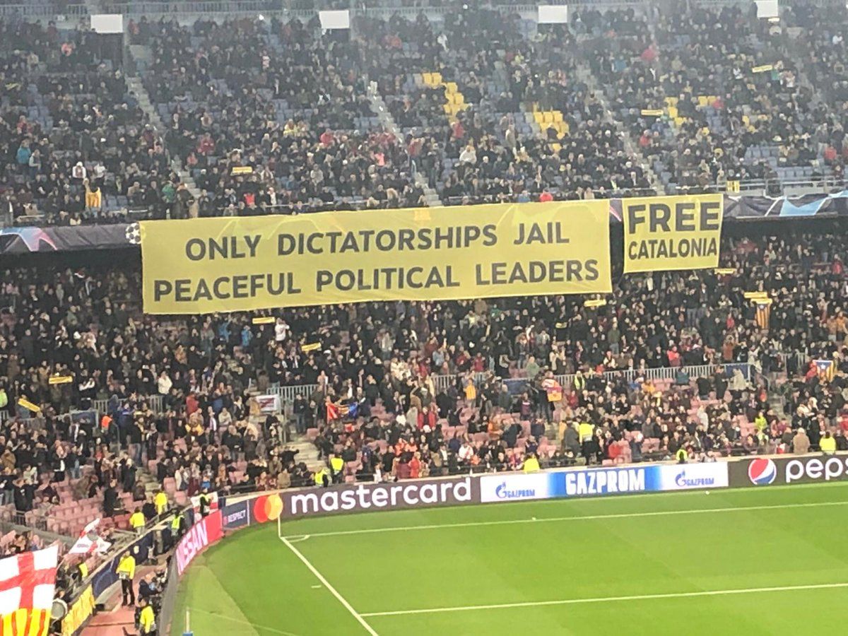 Los rectores de la entidad azulgrana han permitido que una gran pancarta ocupará la tribuna del estadio, justo en el tiro de las cámaras donde se podía leer en inglés «Sólo las dictaduras tienen en la cárcel a líderes políticos pacíficos«, y justo al lado otra pancarta, también en inglés donde se podía leer «Libertad para Cataluña«.