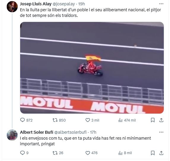 Los miembros de la banda de Waterloo no pierden la ocasión de hacer el ridículo, y ahí está Albert Soler para ponerlos en evidencia una y otra vez. Gracias a gente como él el proceso separatista fue un poco menos doloroso. La victoria de Marc Márquez enorgulleció a toda España y el patetismo de estos radicales no empaña en absoluto lo que fue un orgullo nacional.