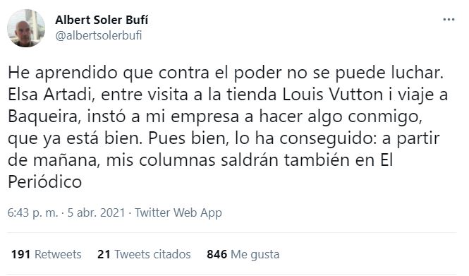 «He aprendido que contra el poder no se puede luchar. Elsa Artadi, entre visita a la tienda Louis Vuitton y viaje a Baqueira, instó a mi empresa a hacer algo conmigo, que ya está bien. Pues bien, lo ha conseguido: a partir de mañana, mis columnas saldrán también en El Periódico», ha difundido Soler.