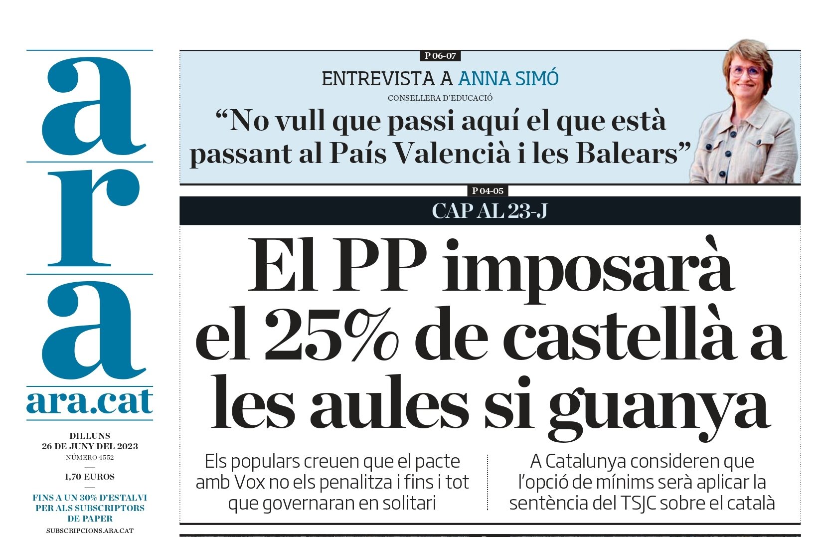 Con un importante titular en portada, el ARA afirma que «El PP impondrá el 25% de castellano en las aulas si gana«. En caso de que eso sea así, lo que hará es hacer cumplir las sentencias judiciales, o lo que es lo mismo, lo que haría cualquier país democrático del mundo. Así lo ha dejado claro en su cuenta de Twitter la Asamblea por una Escuela Bilingüe.