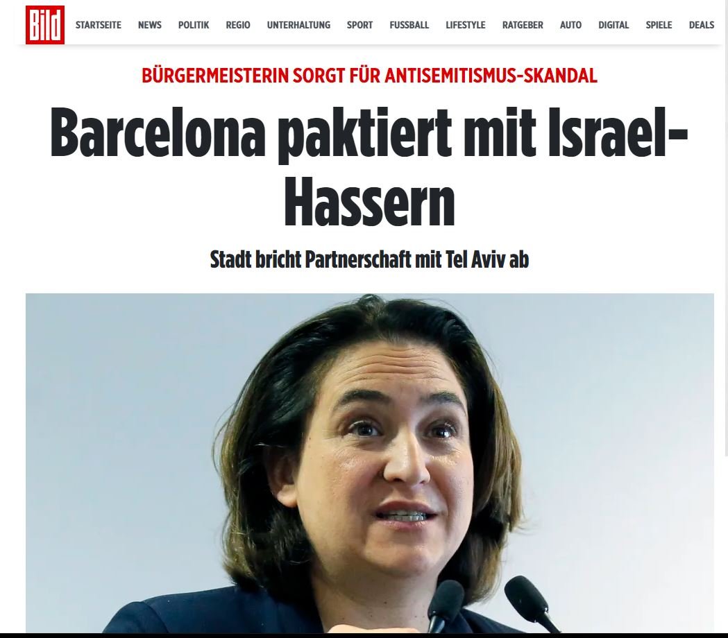 El diario alemán denuncia abiertamente que Colau se ha alineado con «los que odian Israel» y que ha protagonizado un «escándalo de antisemitismo» al romper las relaciones de la capital catalana con el país hebreo y al suspender el hermanamiento con Tel-Aviv. El rotativo titula con evidente indignación por la actitud de Colau, y la presenta claramente como una extremista: «La alcaldesa provoca un escándalo de antisemitismo. Barcelona pacta con los que odian Israel. La ciudad rompe el hermanamiento con Tel-Aviv«.