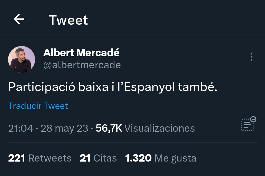 Pero hablábamos sobre el trato mediático que recibe en Cataluña el club espanyolista y este lunes nos hacemos eco del lamentable tuit de Albert Mercadé, director del programa ‘Els Matins de TV3‘, donde trata de hacerse el ‘gracioso’ con la desgracia deportiva de la entidad blanquiazul, mientras que todos los catalanes le pagan un sueldo público.