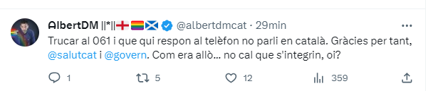 Un secesionista ha compartido en sus redes sociales el verdadero drama que ha vivido cuando ha utilizado este servicio de emergencias, y es que no le han atendido en catalán. Tremendo. «Llamar al 061 y que quien responde al teléfono no hable en catalán. Gracias por tanto, @salutcat y @govern. ¿Cómo era eso… no hace falta que se integren, verdad?«.