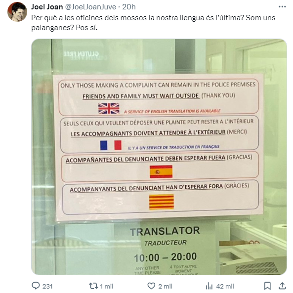 Buceando por las redes sociales independentistas nos hemos topado con un post del actor Joel Joan, en el que describía el ‘drama’ que ha vivido al ir a una comisaría de los Mossos, y es que un cartel informativo situaba al catalán en última posición. Algo que ya han visto los ‘hooligans’ de la lengua como un ataque intolerable hacía el idioma regional.