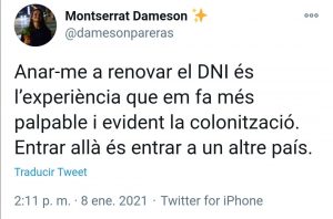 En un tuit ha asegurado que «ir a renovarme el DNI es la experiencia me hace más palpable y evidente la colonización. Entrar allí es entrar en otro país«, sentencia esta separatista en sus redes sociales. Que drama vive la muchacha, que alguien le ayude.