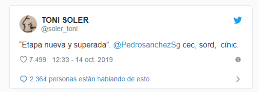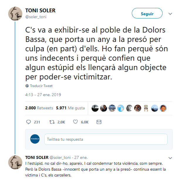 Y al presidente del Gobierno, el socialista Pedro Sánchez, Toni Soler le espetó en un tuit que era un «ciego, sordo y cínico».