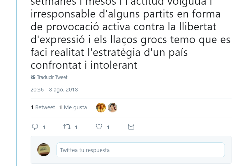 Este médico, que asegura en su cuenta de twitter que sus opiniones son a título personal. asegura que «viendo el calendario de las próximas semanas y meses y la actitud querida e irresponsable de algunos partidos en forma de provocación activa contra la libertad de expresión y los lazos amarillos temo que se haga realidad la estrategia de un país confrontado e intolerante».