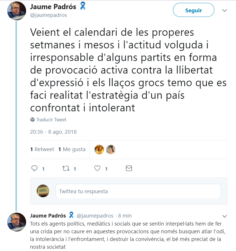 No solo eso. Padrós asegura que «todos los agentes políticos, mediáticos y sociales que se sientan interpelados hemos de hacer un llamamiento para no caer en estas provocaciones que solo buscan atizar el odio, la intolerancia y el enfrentamiento, y destruir la convivencia, el bien más preciado de nuestra sociedad».