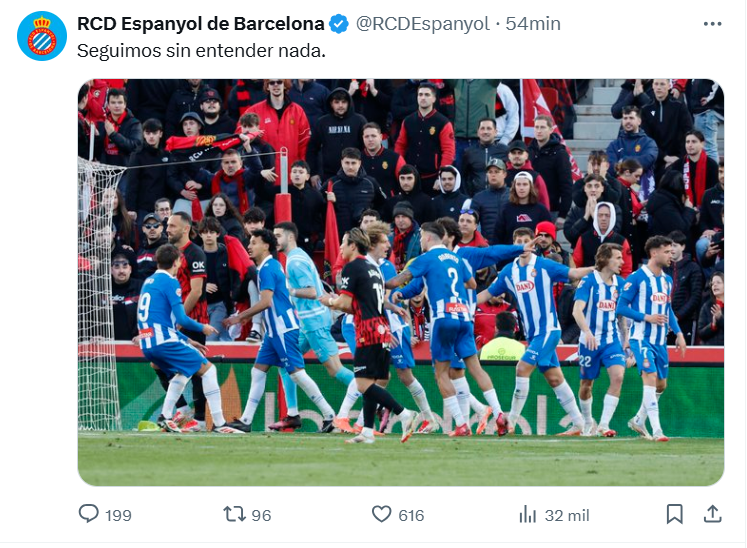 Añadió que al Espanyol «no se le tiene respeto» y confesó que el vestuario del Espanyol «está indignado». Argumentó que «no te pueden decir después de cinco minutos que los jugadores han invadido el área. Ya bajó el Espanyol en su día, nos tendrán que respetar, somos un club fundador, con historia, con una masa social, un club ejemplar, y no se está teniendo en cuenta».