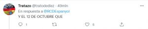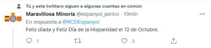 Este hecho, molesta sobremanera a muchos aficionados espanyolistas, ya que el club felicita el día de Cataluña, pero en cambio no hace lo mismo con el día de la Hispanidad. Las redes sociales pericas son un hervidero con este asunto.