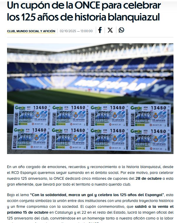 En la web oficial del club se ha publicado este texto: «Bajo el lema ‘Con la solidaridad, marca un gol y celebra los 125 años del Espanyol’, esta acción conjunta simboliza la unión entre dos instituciones con una profunda trayectoria histórica y un firme compromiso con la sociedad. El cupón conmemorativo, que saldrá a la venta el próximo 15 de octubre en Catalunya y el 22 en el resto del Estado, lucirá la imagen oficial del 125 aniversario del club, convirtiéndose en un homenaje tanto a nuestra afición como a la labor inclusiva y transformadora que lleva a cabo la ONCE».