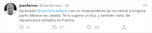 «Apreciado @sanchezcastejon con un vicepresidente así no vamos a ninguna parte. Merece ser cesado. Te lo sugiere un hijo, y también nieto, de republicanos exiliados en Francia«, le ha pedido Ferran al presidente del Gobierno.