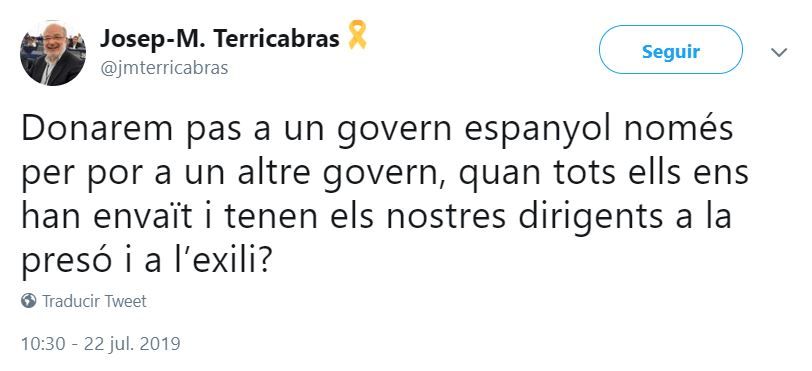 En un mensaje sobre la investidura de Pedro Sánchez, y sobre la postura que debía tener ERC, lanzó la siguiente pregunta: «¿Daremos paso a un gobierno español solo por miedo a otro gobierno, cuando todos ellos nos han invadido y tienen a nuestros dirigentes en la prisión y el exilio?».