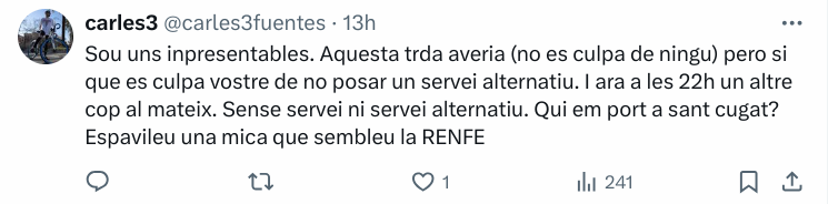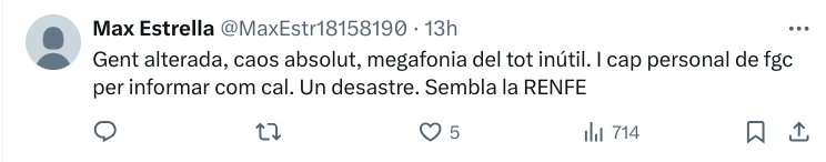 Sin ir más lejos, este pasado martes se sufrieron varios retrasos, y las redes sociales ardían de críticas y de comparaciones con Rodalies. En los medios de comunicación controlados por el Govern apenas se mencionaron los retrasos en los Ferrocarriles de la Generalitat. Una vez más, ha quedado acreditado que el gobierno autonómico no gestiona mejor que el central.