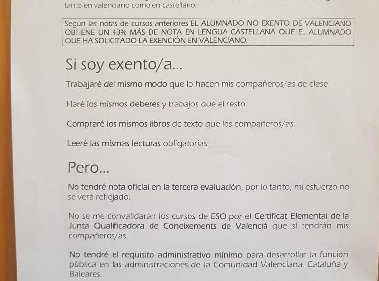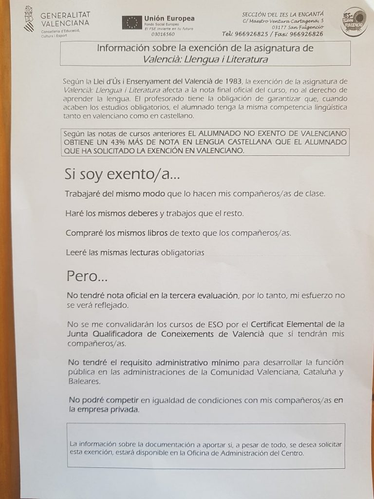 Además, familias de un IES de la Vega Baja, zona castellanohablante en la que la exención se contempla para todos los alumnos sin excepción, se han puesto en contacto con Hablamos Español para denunciar que se les ha enviado un documento sobre la exención de valenciano que les parece manipulador y coactivo. En dicho documento se advierte a los alumnos que si piden la exención no valorarán su esfuerzo, que no podrán trabajar para las administraciones públicas en Cataluña Comunidad valenciana y Baleares y que no podrán competir en igualdad de condiciones que sus compañeros en la empresa privada.