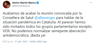 «Acabamos de acabar la reunión convocada por la consellera de Salut @albaverges para hablar de la situación pandémica en Cataluña. Al parecer hemos sido invitados todos los grupos parlamentarios excepto VOX. No podemos normalizar semejante aberración antidemocrática. ¡Basta ya!«, ha afirmado el diputado naranja en sus redes sociales.