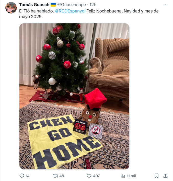 De hecho, las banderas de “Chen Go Home” han sido todo un éxito y miles más se encuentran ya en producción para seguir exigiendo la marcha de la propiedad china de la entidad blanquiazul. El gran Tomás Guasch también se ha pronunciado al respecto en sus redes sociales. Con su habitual humor, el periodista también se ha apuntado en el ‘bando’ de los que piden la marcha de Chen Yansheng. «El Tió ha hablado. @RCDEspanyol. Feliz Nochebuena, Navidad y mes de mayo 2025”. Todo ello junto a una bandera de “Chen Go Home” y pegatinas contra la propiedad.