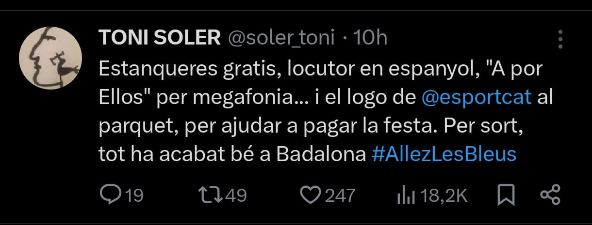 Soler dijo que la bandera de España es la «estanquera», una denominación despreciativa típica del separatismo catalán. Y, por supuesto, disfrutó de la victoria de Francia. Este es el resumen del partido que hizo en su perfil de la red social X: «Estanqueras gratis, locutor en español, ‘A por ellos’ por megafonía y el logo de Esportcat al parquet para ayudar a pagar la fiesta. Por cierto, todo ha acabado bien en Badalona. Viva los azules [Francia]».
