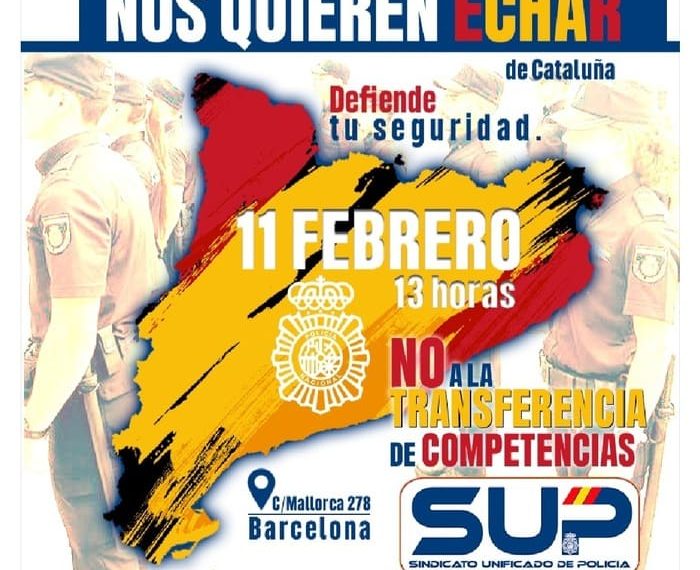 El sindicato SUP ha convocado una protesta ante la Delegación del Gobierno en Cataluña para el próximo martes 11 de febrero, a las 13.00 horas para protestar por el posible traspaso de competencias en materia de inmigración y fronteras.