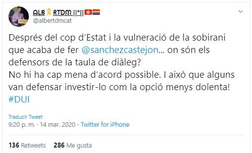 «Después del golpe de Estado y la vulneración de la soberanía que acaba de hacer Pedro Sánchez, ¿dónde están los defensores de la mesa de diálogo? No hay ningún tipo de acuerdo posible. ¡Y eso que algunos defendieron investirlo como la opción menos mala!