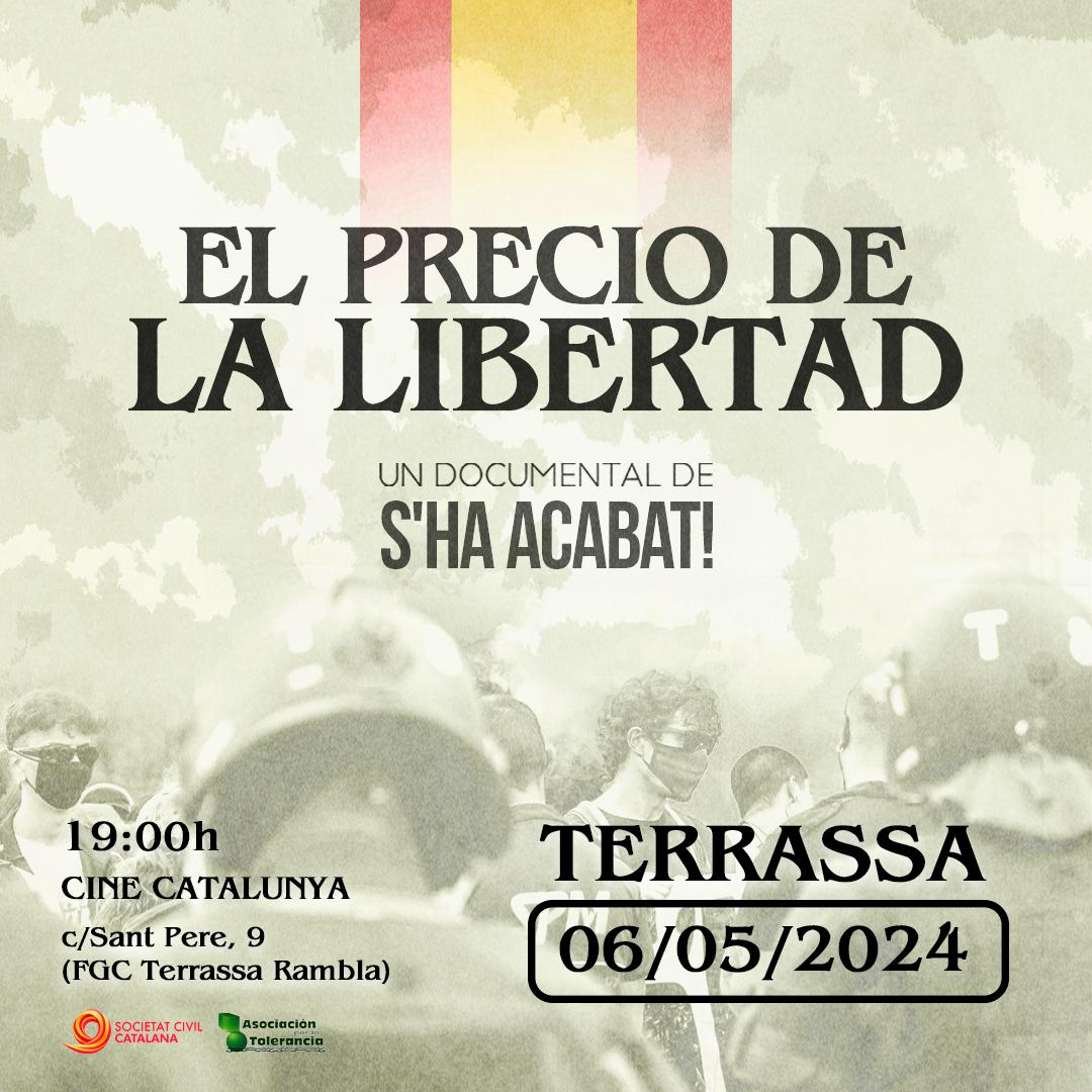 El lunes 6 de mayo en Terrassa S’Ha Acabat proyectará a las 19:00 en el Cine Catalunya (Sant Pere, 9) su documental ‘El precio de la libertad’ (50 minutos), con el apoyo de la Asociación por la Tolerancia y SCC. Desde BCN se puede llegar en transporte público: bajando en la parada «Terrassa Rambla» de los FFGG.