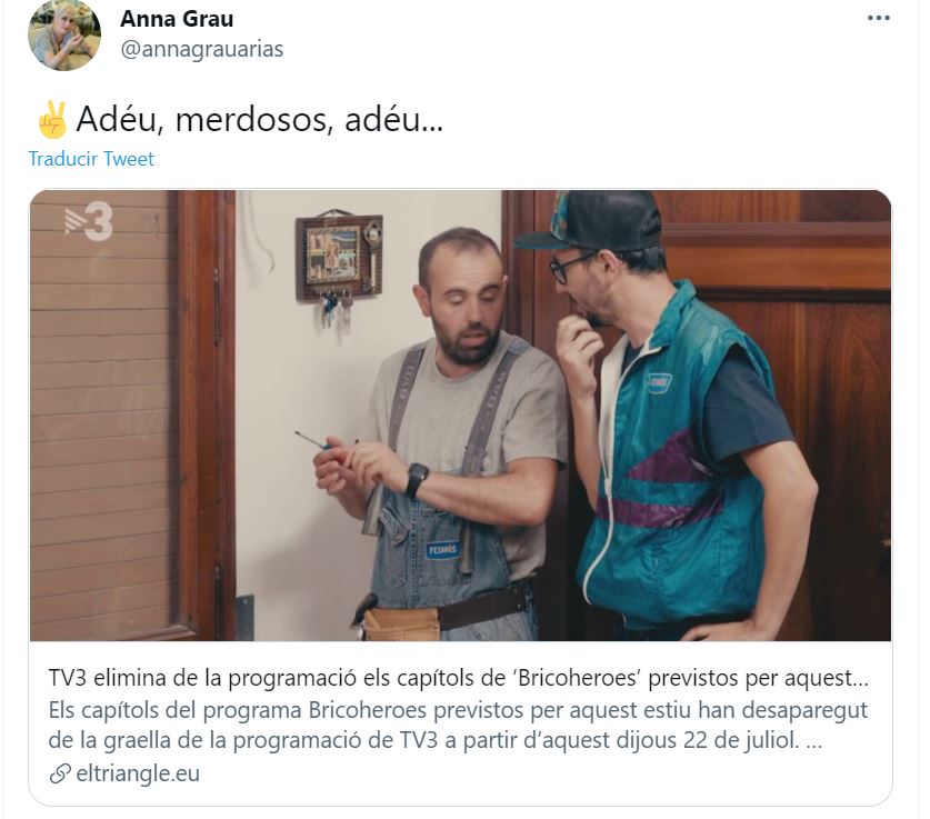 TV3 ha eliminado de su parrilla el programa humorístico Bricohéroes, presentado por Jair Domínguez y Lluís Jutglar (Peyu). El motivo no ha sido las continuas faltas de respeto a los símbolos comunes a todos los españoles. En este espacio se ha dicho que preferían una cinta con esvásticas que otra con los colores de la bandera “española” y se ha gritado “Puta España”.