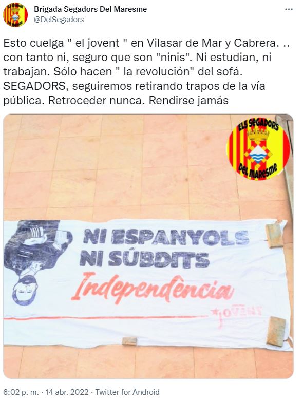 «Esto cuelga ‘el jovent’ en Vilassar de Mar y Cabrera. Con tanto ni, seguro que son «ninis». Ni estudian, ni trabajan. Sólo hacen ‘la revolución’ del sofá. SEGADORS, seguiremos retirando trapos de la vía pública. Retroceder nunca. Rendirse jamás», han difundido en sus redes sociales.