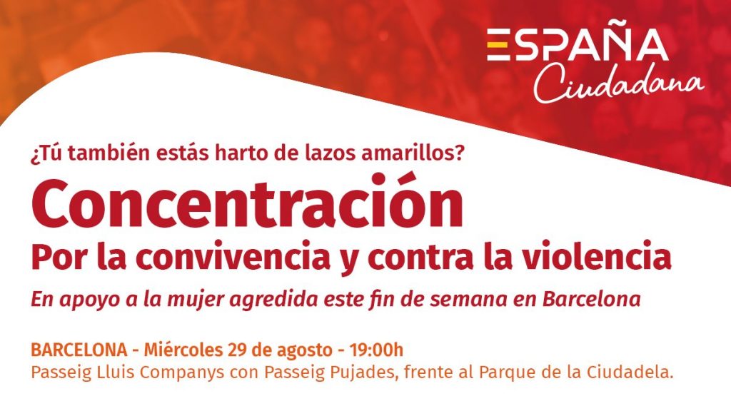 El miércoles 29 de agosto la plataforma España Ciudadana organiza una concentración en apoyo a la mujer agredida este fin de semana en Barcelona por un separatista por quitar lazos amarillos. El lema es «por la convivencia y contra la violencia».