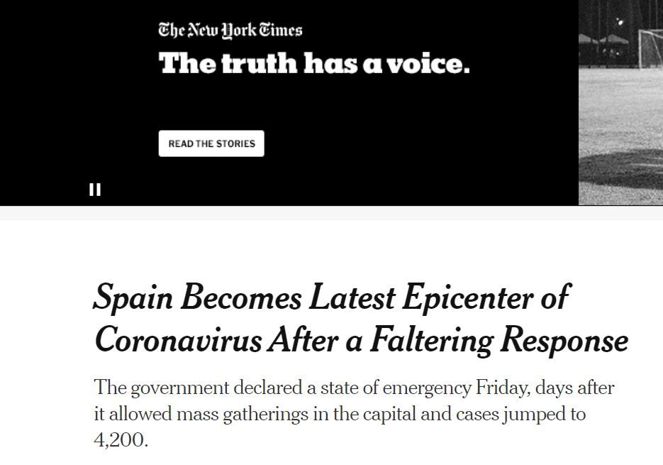 El corresponsal de este rotativo en España, Raphael Minder, titula una crónica sobre la respuesta del Gobierno de Pedro Sánchez a la crisis sanitaria así: «España se convierte en el último epicentro del coronavirus después de una respuesta vacilante».