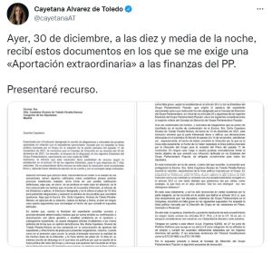 «Ayer, 30 de diciembre, a las diez y media de la noche, recibí estos documentos en los que se me exige una ‘Aportación extraordinaria’ a las finanzas del PP. Presentaré recurso«, afirmaba la que fue cabeza de lista del Partido Popular por la provincia de Barcelona en las últimas generales.