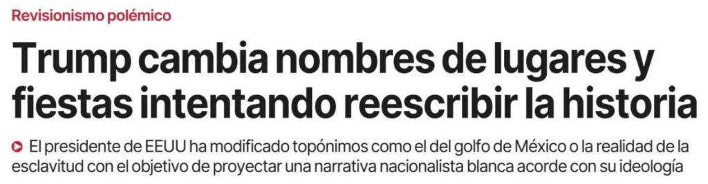 ‘El Periódico de Catalunya’ dedicó este lunes un amplio reportaje al «revisionismo histórico» de Donald Trump, el presidente de los Estados Unidos. La pieza argumentaba que «a golpe de decretos, presiones simbólicas o medidas ejecutivas, ha impulsado el renombramiento de instituciones, espacios geográficos y festividades nacionales con el objetivo explícito de proyectar una narrativa nacionalista blanca, desplazando términos, hitos y nombres que, en su visión, ‘denigran’ a los estadounidenses. El objetivo: reordenar el lenguaje público para redefinir la identidad nacional. Y, por extensión, su historia».