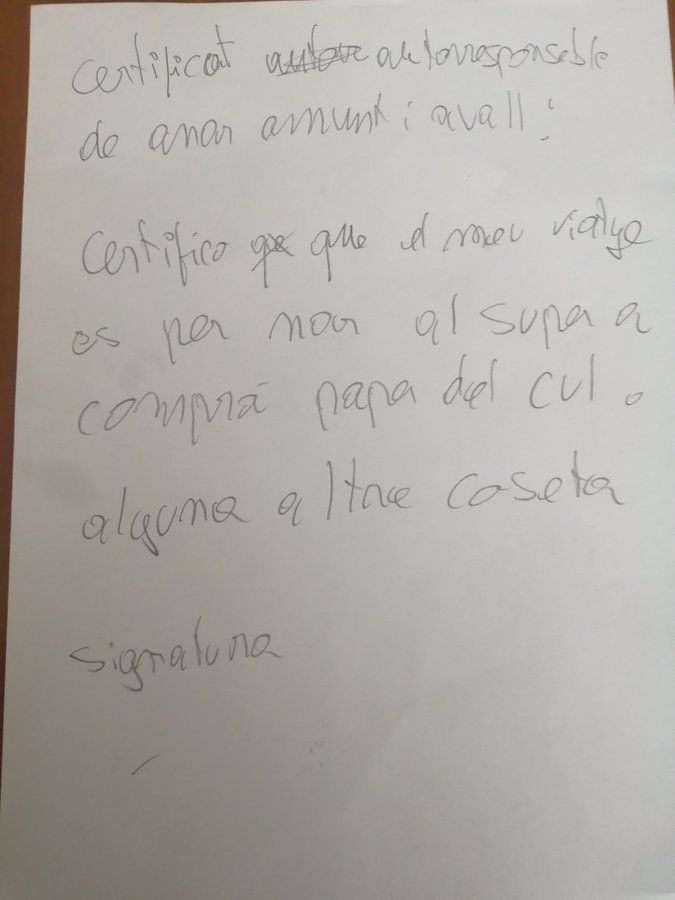 El texto del ‘salvoconducto’ de Soler, escrito a mano, dice lo siguiente: «Certificado autoresponsable para ir arriba y abajo. Certifico que mi viaje es para ir al súper a comprar papel del culo y alguna otra cosita«.