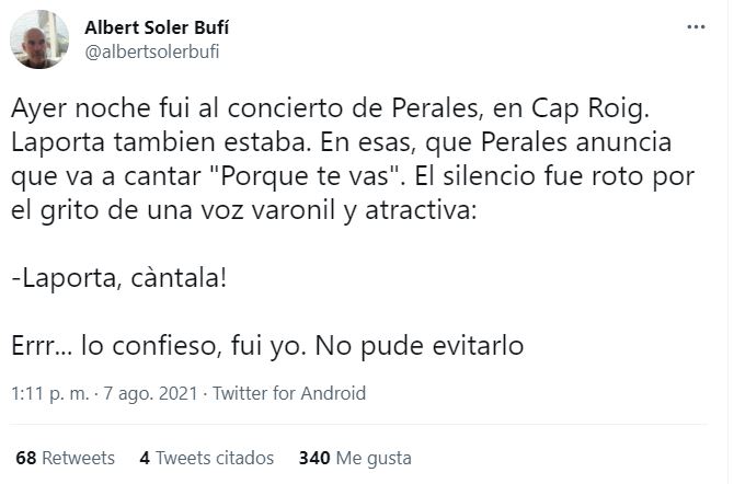 Albert Soler confesó en su cuenta personal de Twitter que el ‘espontáneo’ que fue él quién pidió a Joan Laporta que cantara el éxito de Perales ante el público de Cap Roig.