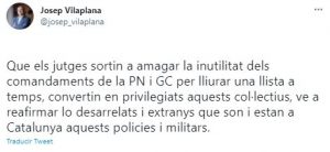 «Que los jueces salgan a esconder la inutilidad de los mandos de la Policía Nacional y la Guardia Civil para entregar una lista a tiempo, convirtiendo en privilegiados a estos colectivos, viene a reafirmar cómo de desarraigados y extraños son y están en Catalunya estos policías y militares«, ha sentenciado Vilaplana en su cuenta de Twitter.