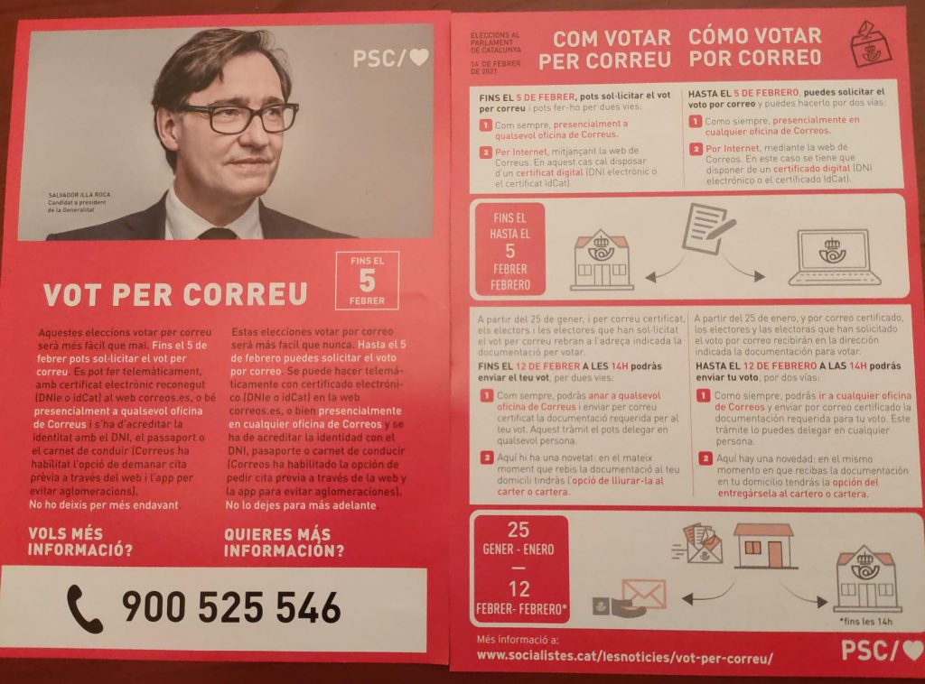 El PSC ha buzoneado en buena parte del área metropolitana de Barcelona, uno de sus feudos electorales, con un folleto con la imagen de su candidato, Salvador Illa, y con la información necesaria para hacer este trámite. Incluso facilitan un teléfono gratuito de información y una web específica para este fin. El folleto está escrito en catalán y castellano.