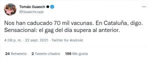 El periodista Tomás Guasch ha tirado de ironía para comentar el asunto en sus redes sociales, donde ha asegurado que «nos han caducado 70 mil vacunas. En Cataluña, digo. Sensacional: el gag del día supera al anterior«.