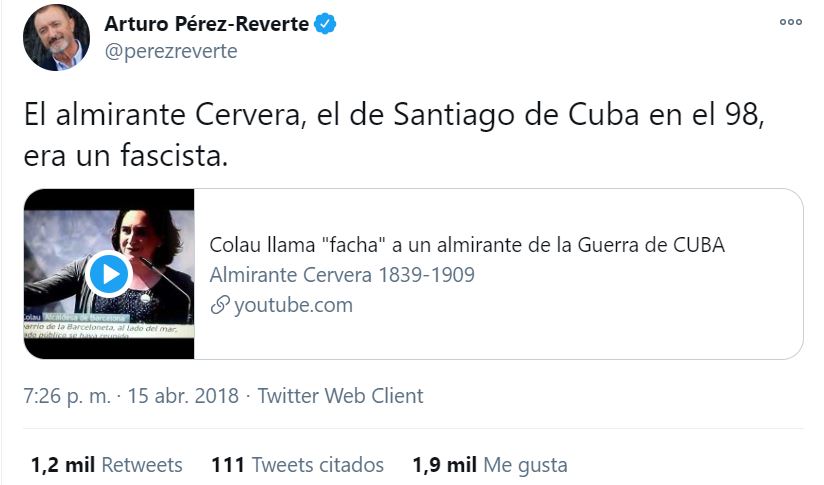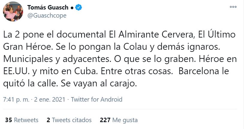 «La 2 pone el documental ‘El Almirante Cervera, El Último Gran Héroe’. Se lo pongan la Colau y demás ignaros. Municipales y adyacentes. O que se lo graben. Héroe en EE.UU. y mito en Cuba. Entre otras cosas. Barcelona le quitó la calle. Se vayan al carajo«, dijo Guasch en su perfil personal de Twitter.