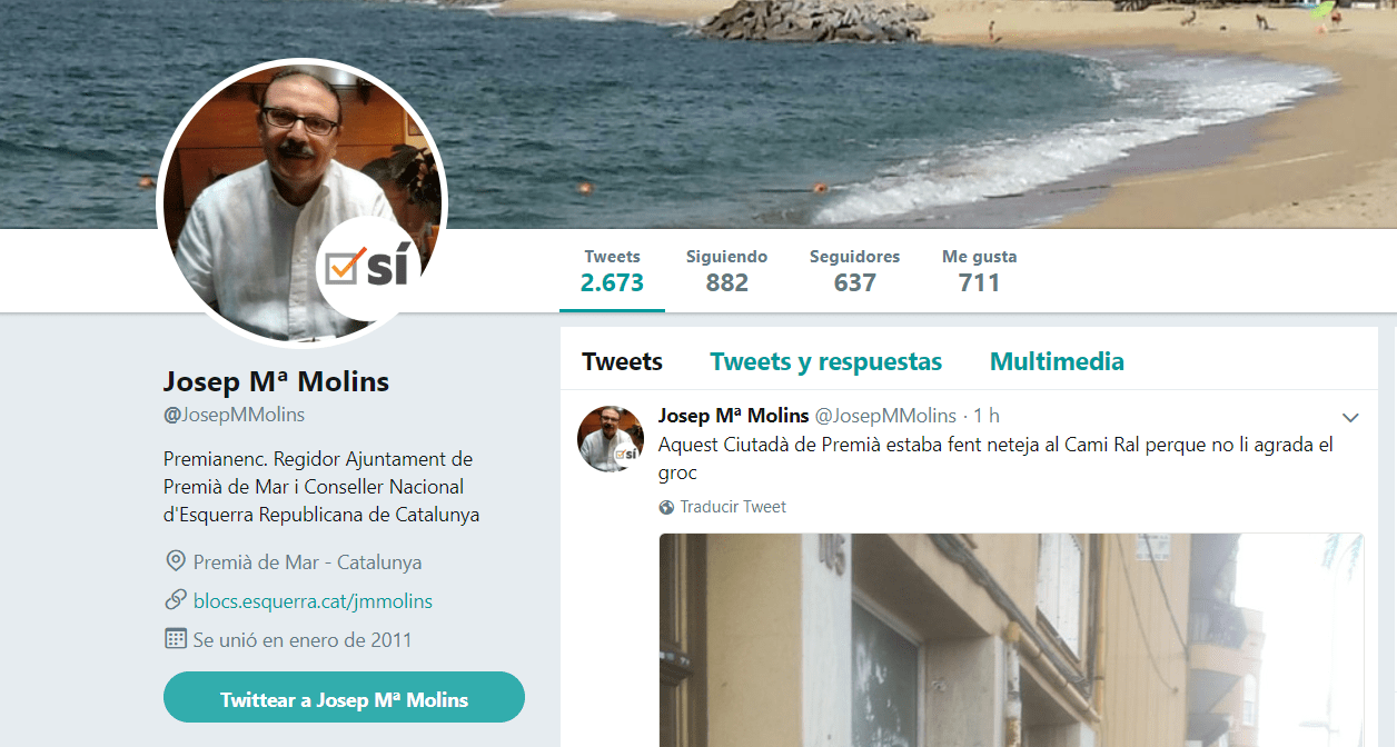 Molins, que a pesar de ser cargo público puso en el ojo del huracán a un ciudadano que puede recibir represalias, redactó el siguiente texto: “Este ciudadano de Premià estaba haciendo limpieza al Camí Ral porque no le gusta el amarillo”.