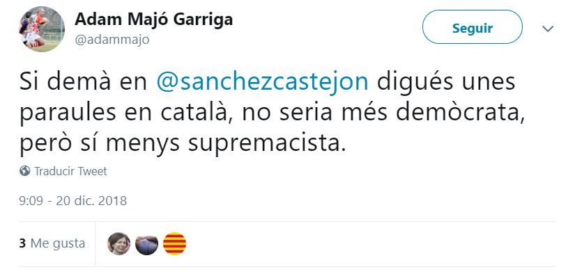Un día antes de la celebración de Consejo de Ministros en Barcelona Adam Majó colgó el siguiente mensaje en su cuenta personal de Twitter: «Si mañana Pedro Sánchez dijera unas palabras en catalán, no sería más demócrata, pero sí menos supremacista».