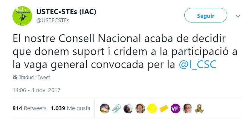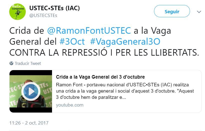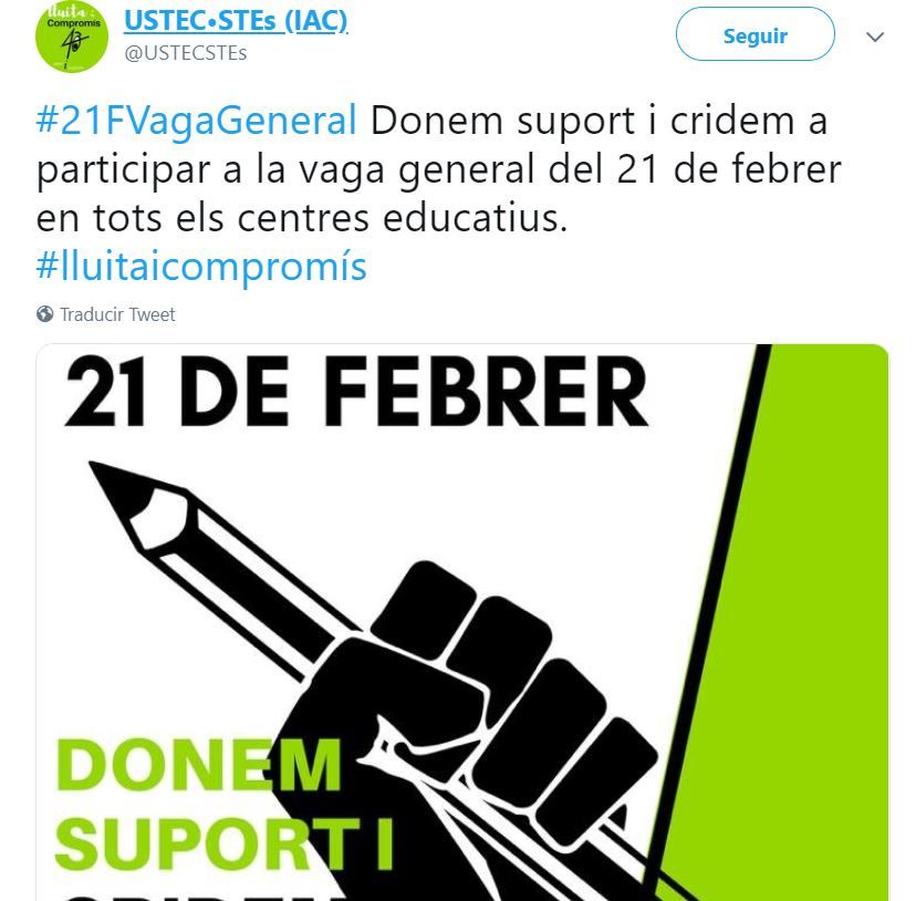 El sindicato USTEC, entidad que ha apoyado las huelgas generales ‘patrióticas’ del 3 de octubre de 2017, 8 de noviembre de 2017 y 21 de febrero de 2019, ha ganado las elecciones sindicales entre los profesores de la enseñanza pública de Cataluña.