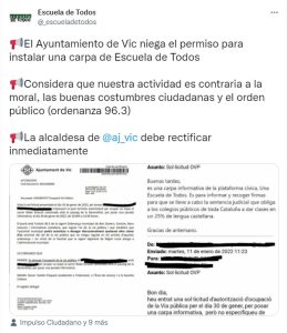 Esto ha sucedido en Vic, donde el Ayuntamiento en manos de los separatistas ha denegado el permiso a Escuela de Todos para montar una carpa informativa en la calle el próximo 30 de enero, tal y como tenía programada esta entidad.