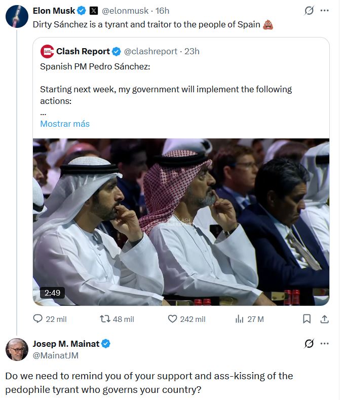 El líder del PSOE ha encontrado un aliado inesperado en el separatista radical Josep Maria Mainat, el exempresario televisivo responsable de éxitos como ‘Operación Triunfo’ o ‘La parodia nacional’. Este excantante del grupo ‘La Trinca’ ha defendido a Sánchez diciéndole a Musk que «¿Tenemos que recordarte tu apoyo y cómo le besas el culo al tirano pedófilo que gobierna tu país?».